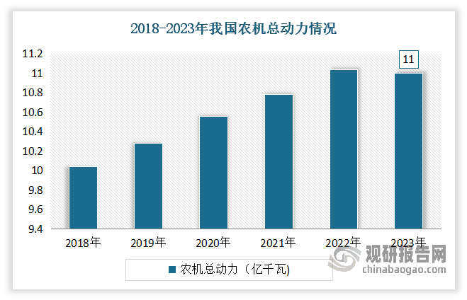 机械总动力持续增加。近年我国农业机械总动力持续增加,到目前曾经成为农业出产中不成或缺的一部门。农人也越来越依赖农业机械进行出产,对于提超出跨越产效率和降低劳动强度有着主要感化。数据显示,2023年我国农机总动力达到11亿千瓦。