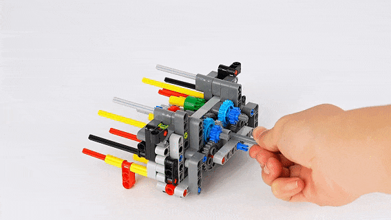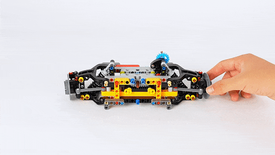迈凯伦P1的7速变速箱,是正在齿轮组的布局之上拼搭而成,下图中左上角红色橡皮筋的下方,是一个棘轮零件,来联动它前方带有滑槽的变速器零件,变换档位后实现分歧尺寸的齿轮从头组合,实现策动机转速的变换,这个换挡功能我将正在本文的后面,为大师进行愈加曲不雅的引见。